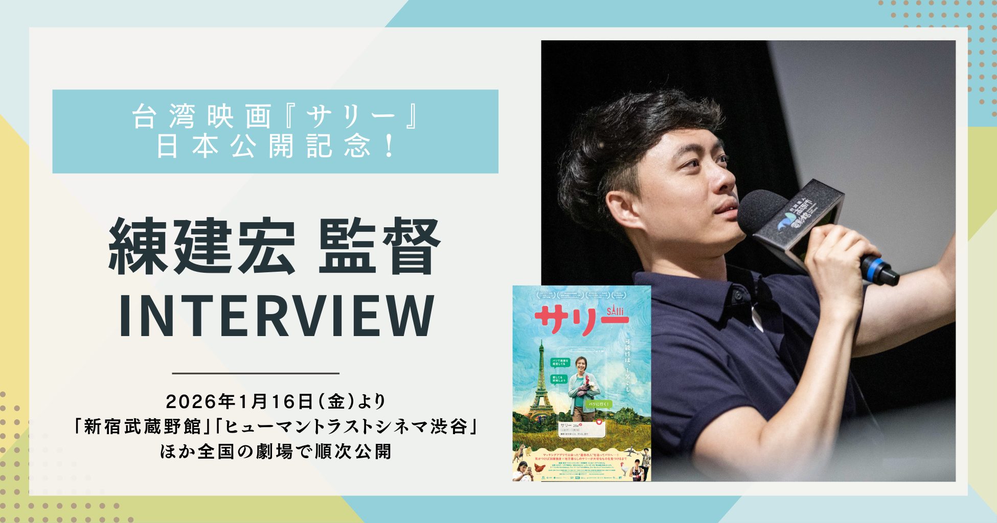 国際ロマンス詐欺に遭ったアラフォー女性の恋と人生を描く、台湾映画『サリー』(原題:莎莉)が、2026年1月16日(金)より日本で公開されました! 本作品の公開を記念して、Howto Taiwan では本作の監督を務めた練建宏さんにインタビューをさせていただきました。作品が生まれたきっかけや配役の決定、撮影現場の裏側など、制作にまつわるあれこれを根掘り葉掘り聞いてきましたよ〜!